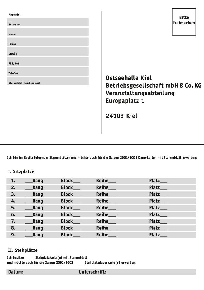 Um das Ausgabeverfahren zu beschleunigen und Ihnen eine umgehende Abwicklung mit entsprechender Rechnungslegung garantieren zu können, benötigen wir Ihre Personalien. Wir bitten Sie daher, die dem heutigen Hallenheft (2. Mai 2001) beigeheftete Postkarte vollständig ausgefüllt in der Pause oder beim Verlassen der Halle in die Behälter im Foyer und in den Umgängen zu werfen oder per Post zu versenden. Versäumen Sie die Abgabe der Postkarte, müssen Ihre Personalien bei der Abholung der Dauerkarte erfaßt werden. Dies führt zwangsläufig zu Verzögerungen, verlängert die Wartezeiten und gefährdet den Erhalt der Dauerkarte. Falls Sie das Eisenach-Spiel in der Ostseehalle verpaßt haben sollten, finden Sie nebenstehend das Formular zum Ausdrucken und Ausfüllen.
