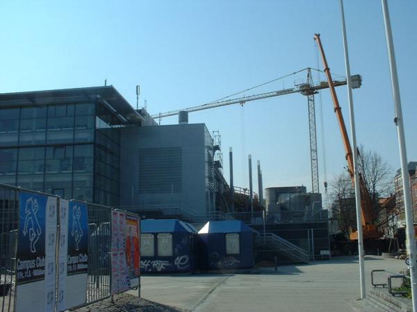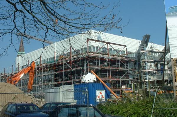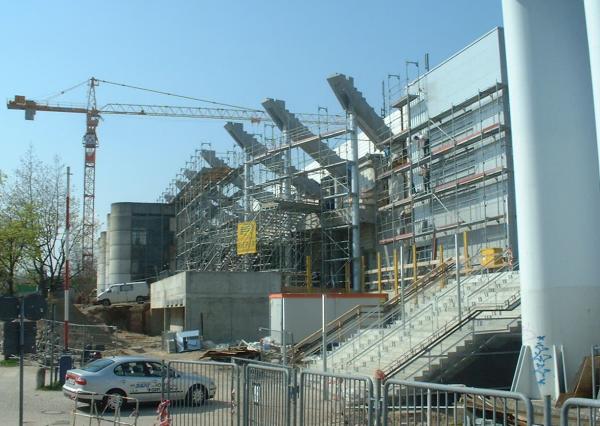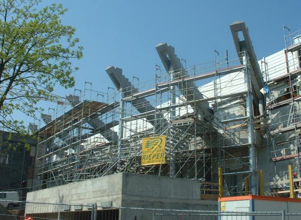 Der Ostseehalle wachsen Flügel: Zur Zeit werden an ihren Seiten Pfeiler und Betonsockel für den vierten Rang installiert. Gleichzeitig werden die alten Ausgangs-Türme demontiert.