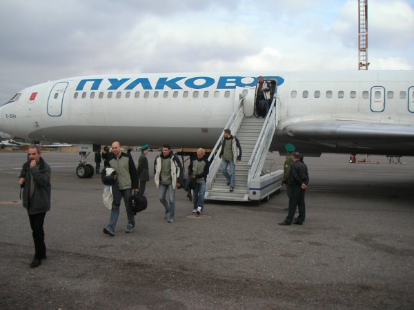 erleichtert aus dem Flieger, der sicher in Astrachan gelandet ist.
