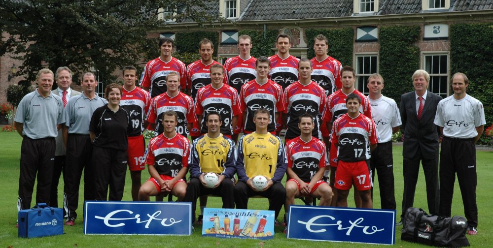 Hinten von links: Ursic, Machulla, Glandorf, Przybecki, Arrhenius; Mitte von links: Beteuer Leissink, Arzt Dr. Humberg, Betreuer Gierveld, Physiotherapeutin Petersen, Schumann, Franzen, Wolterink,
