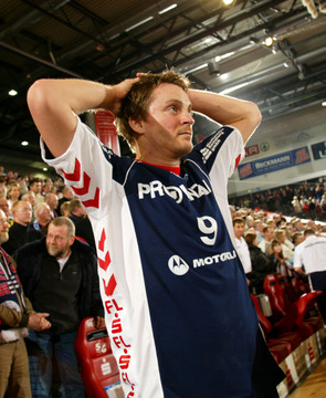 Sie hatten bis zur Erschöpfung gekämpft und mit großartiger Unterstützung der 6000 Fans die Schmach von Montpellier ausgelöscht. Als die Uhr abgelaufen war, hielt das Team von Trainer Kent-Harry Andersson die Sensation beim 32:18 in Händen: 14 Tore vor, Gleichstand und die auswärts mehr erzielten Treffer. Fehlte nur der Abpfiff. Doch das gute ungarische Schiedsrichtergespann Kekes/Kekes entschied auf einen letzten Freiwurf. Auszuführen linke Seite, zwei Meter neben der Auslinie, Torchance so gut wie Null. Einziges Handicap: Die Flensburger Menschenmauer zählte nach zwei Hinausstellungen nur noch vier Mann. Rechtsaußen Gregory Anquetil schnappte sich - versteckt in Knäuel seiner Mitspieler - den Ball, drehte diesen an der SGWand vorbei und schickte ihn durch die Beine des überragenden Jan Holpert ins SG-Netz.