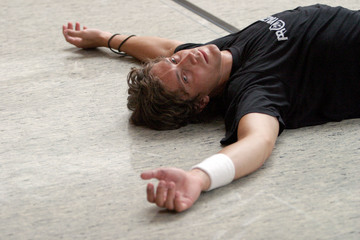 Trainingslager 2005: Marcus Ahlm liegt erschöpft auf dem Rücken am Boden und hat die Arme von sich gestreckt. Trainingslager 2005: THW-Neuzugang Pelle Linders kniet mit gesenktem Kopf erschöpft am Boden. Trainingslager 2005: Wer wie Stefan Lövgren aus Verletzungsgründen nicht läuft, der fährt stattdessen auf den Straßen rund um Obenstrohe Fahrrad. Trainingslager 2005: Wer wie Stefan Lövgren aus Verletzungsgründen nicht läuft, der fährt stattdessen auf den Straßen rund um Obenstrohe Fahrrad.