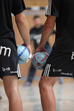 Trainingslager 2005: Wer wie Mattias Andersson aus Verletzungsgründen nicht läuft, der fährt stattdessen auf den Straßen rund um Obenstrohe Fahrrad. Trainingslager 2005: Impressionen: Zwei Spieler halten lässig je einen Ball. Trainingslager 2005: Neuzugang Kim Andersson am Ball. Trainingslager 2005: THW-Trainer Noka Serdarusic (links) erläutert seinem Kapitän Stefan Lövgren das taktische Spiel.