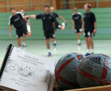 Trainingslager 2005: Das Motto der THW-Saisonvorbereitung 2005/06 ist bereits auf dem Titel des Trainingsplans festgeschrieben: " Der Titel geht nur über uns!" Trainingslager 2005: Co-Trainer Klaus-Dieter Petersen (stehend) leitet athletische Training seiner Mannschaft. Trainingslager 2005: Co-Trainer Klaus-Dieter Petersen (stehend) leitet athletische Training seiner Mannschaft. Trainingslager 2005: THW-Kapitän Stefan Lövgren und zwei seiner Mannschaftskameraden bei Sit Ups.