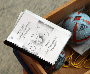 Trainingslager 2005: Der Name ist Programm: Christoph Schindler schindet sich beim Bauchmuskeltraining. Trainingslager 2005: Das Motto der THW-Saisonvorbereitung 2005/06 ist bereits auf dem Titel des Trainingsplans festgeschrieben:  Der Titel geht nur über uns! Trainingslager 2005: Neuzugang Kim Andersson fällt bei einer Übung von einer Weichbodenmatte und kriecht über den Boden. Trainingslager 2005: THW-Kapitän Stefan Lövgren stemmt beim Krafttraining eine Eisenstange.
