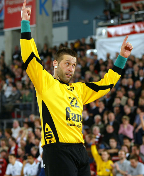 Eigentlich ist Chrischa Hannawald ein ruhiger Zeitgenosse. Der Vater einer Tochter gibt als liebste Freizeitbeschäftigung seine Familie an. Wer ihn jedoch einmal auf dem Handballfeld gesehen hat, könnte meinen, er würde nie zur Ruhe kommen - so verrückt und emotionsgeladen benimmt sich der 35-Jährige in seinem Beruf des Handballtorwarts. Seine Marotte, mit kurzen Hosen den harten Würfen der Gegner entgegen zu springen, untermauert seine Extravaganz. Die rebellische Art spiegelt sich auch in seiner Haarfarbe wider, die des Öfteren variiert. Er springt wie von der Tarantel gestochen durch den Torraum, brüllt seine Gegenspieler an, rüttelt seine eigene Mannschaft lautstark wach und hat so manches Spiel beinahe alleine entschieden. Den Dialog mit Zuschauern und Spielern braucht der gebürtige Schwabe wie die Luft zum Atmen. "Emotionen mit den Zuschauern auszutauschen, gehört für mich einfach dazu. Und solange es fair bleibt, haben alle etwas davon. Außerdem: Wenn die ganze Halle gegen einen ist, wirkt das auf mich noch motivierender", sagt Hannawald gelassen. Unvergessen seine Leistungen aus der Bundesligapartie gegen den Meisterschaftsanwärter VfL Gummersbach, der in der vergangenen Saison in Großwallstadt das gesamte Können Hannawalds zu spüren bekam. 32:20 hieß das Endergebnis - es war eine Hannawald-Gala, von der man in Großwallstadt noch lange sprach.