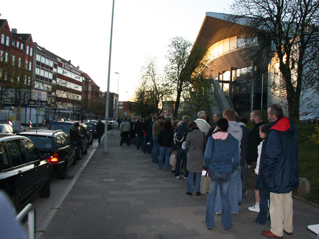 und damit zweieinhalb Stunden vor Kassenöffnung, reicht die Schlange vor der