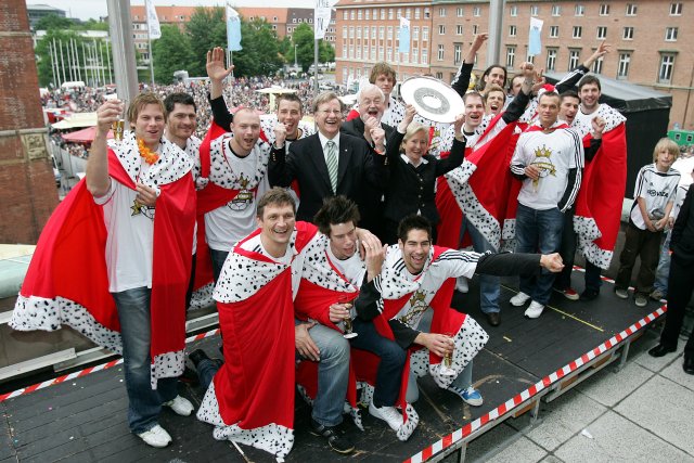 ließen sich Kiels Helden feiern - und zeigten dabei gerne die drei silbernen Trophäen,
