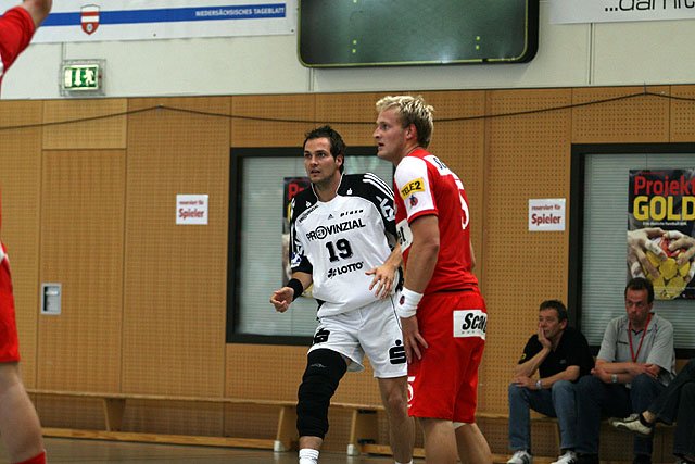 Gestern warteten die Ungarn von MKB Veszprem - Kiels "alter Bekannter aus dem Champions-League-Viertelfinale der vergangenen Saison - im Finale. Veszprem hatte im Halbfinale den späteren Turnierdritten HSV Hamburg mit 33:30 und einer fulminanten 20:8-Halbzeit aus dem Weg geräumt und bot dem THW einen spannenden Kampf bei hochsommerlichen Temperaturen in der ausverkauften Schneverdingener KGS-Halle. Nach einer komfortablen 10:5-Führung (15.) erwiesen sich die Wechsel von Stefan Lövgren für Börge Lund in der Rückraum-Mitte und Karabatic für Anic am Kreis als wenig förderlich für das Kieler Spiel. Bis zur Pause ging Veszprem mit 17:15 in Führung, angeführt von seinem gefährlichen "Shooter" Zarko Sesum.