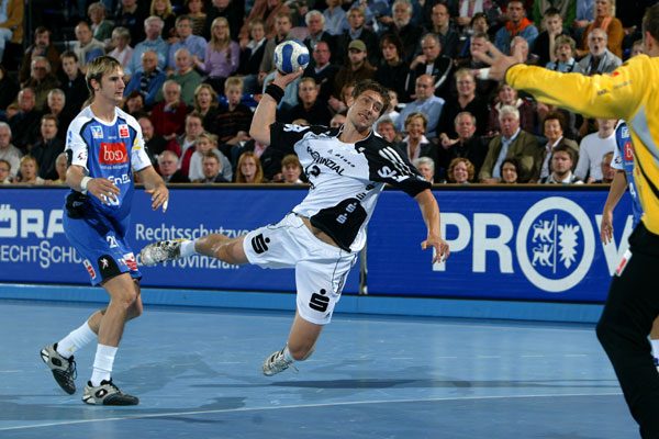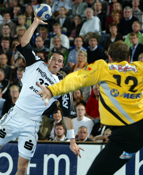 Balingen spielte weiter geduldig und konnte froh sein, dass das Schiedsrichtergespann Harms/Mahlich sich nur selten dazu aufraffen konnte, den Arm wegen passiven Spiels zu heben. Mitte der ersten Halbzeit fuhren die Gäste mit dieser Taktik aber sehr gut und verkürzten etwas auf 5:7 (17.). Davon profitierten sie aber auch von zwei verworfenen Strafwürfen der Kieler, die sich noch immer schwer taten im Angriff. Als Marcus Ahlm erneut nur unfair gestoppt werden konnte, trat der ansonsten heute nicht eingesetzte Henrik Lundström zum Siebenmeter an und traf zum 8:5 - endlich war der Knoten geplatzt. Auch bei den anderen "Problemkindern" im Angriff: Pajovic gelang in seinem vierten Wurfversuch endlich der langersehnte und vielumjubelte erste Heimtreffer, kurz darauf bediente der Slowene dann zweimal Marcus Ahlm, ehe Börge Lund mit seinem dritten Treffer das Ergebnis auf 13:5 (27.) schraubte. Erst ein von Daniel Brack verwandelter Siebenmeter beendete die elfminütige Torflaute der Balinger, die noch immer kein Mittel gegen die Kieler Deckung gefunden hatten. So ging es mit einer mehr als beruhigenden 15:7-Führung, aber bislang ohne große spielerische Höhepunkte in die Kabinen.