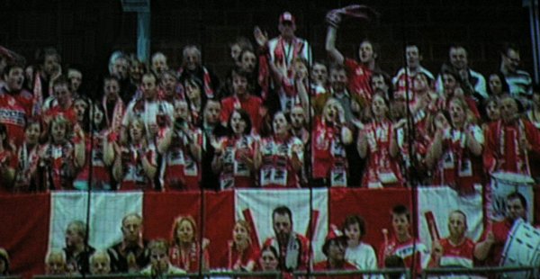 Klicken Sie zum Vergrößern! Jubelnde HSG-Fans im ausverkauften Euregium in Nordhorn.