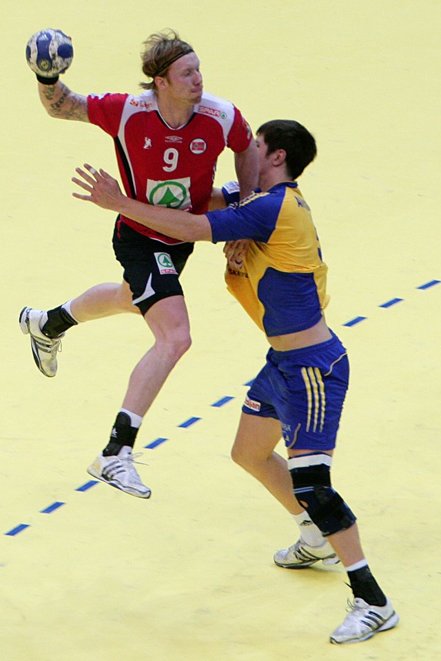 Klicken Sie zum Vergrößern! THW-Duell im Nationalmannschaftsdress: Börge Lund wird von Kim Andersson gestoppt.