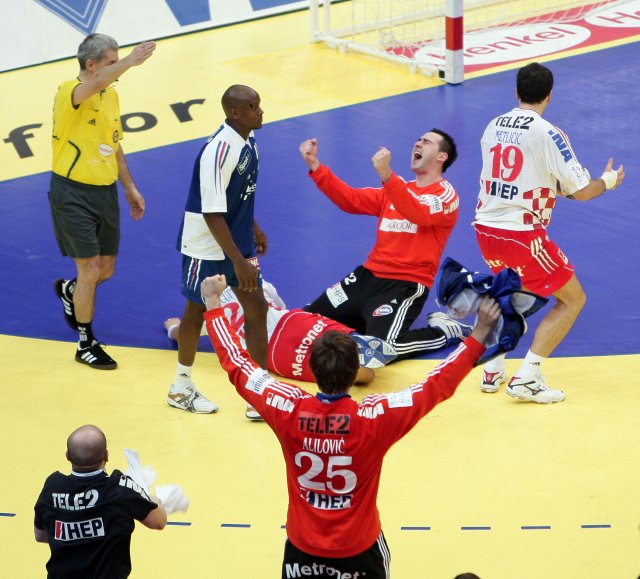 Klicken Sie zum Vergrößern! Der kroatische Torwart Somic geht auf die Knie. Gerade hat er den entscheidenden letzten Wurf der Franzosen gehalten.
