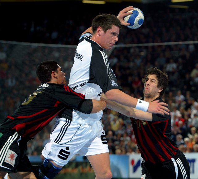 Ivrys Guilbert versucht, sich gegen den vor dem Spiel als "Schleswig-Holsteins Sportler des Jahres" geehrten Nikola Karabatic durchzusetzen.