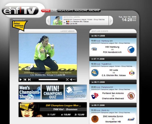 Plattform der EHF-Marketing GmbH, auf der Handball-Fans nicht nur ausgewählte Spiele der