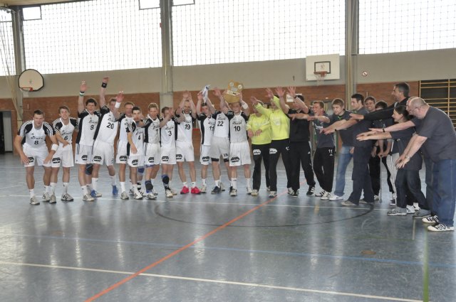 Am vorletzten Spieltag in der Oberliga Schleswig-Holstein wurde es offiziell: Das Team des THW Kiel steigt auf! Wilfried Tetjens, Männerspielwart des Handball-Verbandes Schleswig-Holstein, übergab vor dem Spiel die Meister-Tafel an Kapitän Dennis Olbert, der sich gemeinsam mit seiner Mannschaft auf die kommende Regionalliga-Saison freut. "Wir müssen uns aber auch von einigen Stammkräften verabschieden", sprach Team-Manager Tobias Dahm ins Mikrofon. "Thomas Zakel, Daniel Schütte und Sven Karsten werden in der nächsten Spielzeit nicht mehr zu Truppe des Junior-Teams gehören."
