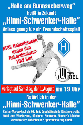Anlässlich der Umbenennung der Bremer "Halle am Bunnsackerweg" in "Hinni-Schwenker-Halle" absolviert der THW Kiel dort am Samstag, den 1. August 2009 ein Freundschaftsspiel gegen den ATSV Habenhausen. Weitere Infos finden Sie weiter oben.