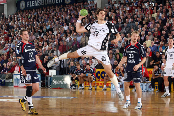 Der freundliche Empfang schien die "Zebras" zu beflügeln. Konzentriert in der Abwehr, selbstbewusst, mit flüssigem Kombinationsspiel im Angriff legten Kim Andersson und Dominik Klein die schnelle 2:0-Führung vor. Der zuletzt "zappelige" Rückraum zauberte, traf aus allen Lagen. Gefahr kam auch von den Außen. Klein traf vor der Pause fünf-, Christian Sprenger viermal, am Ende standen gar acht Tore auf dem Konto des Rechtsaußen. Zu ganz großer Form lief Momir Ilic auf. Viermal versenkte der Serbe den Ball von der Siebenmeterlinie, dreimal wuchtete er das Spielgerät in den ersten 30 Minuten aus dem Rückraum an den Flensburger Torhütern vorbei ins Netz. Filip Jicha tat es ihm fast gleich, der Tscheche führte gekonnt Regie und traf ebenfalls wie er wollte. Ungewohnte Ladehemmung hatte nur Marcus Ahlm. Der sonstige THW-Torgarant scheiterte mehrfach freistehend an Beutler oder schmetterte den Ball ans Holz. Allein, der Kieler Dominanz tat sein "gebrauchter Tag" nicht weh.