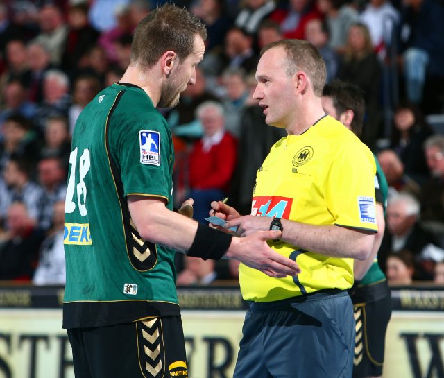 Klicken Sie zum Vergrößern! Diskussionsbedarf mit dem Schiedsrichter-Gespann hatte nicht nur GWD-Spielmacher Stephane Just.