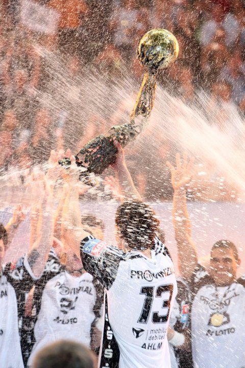 Der große Moment: Marcus Ahlm reckt den riesigen Pokal in die Höhe.