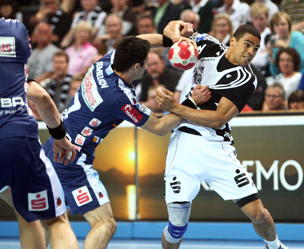 Dann allerdings wurde es erst einmal wieder ernst: Alfred Gislason, der auf den noch immer angeschlagenen Momir Ilic verzichtete, startete mit seinem "Stammpersonal" um Narcisse, Jicha und Zeitz im Rückraum, Ahlm am Kreis sowie Sprenger und Klein auf den Außenpositionen. Im Tor begann Thierry Omeyer, Börge Lund verstärkte statt Christian Zeitz die Abwehr. Und von Müdigkeit nach den zwei schweren Spielen in Köln gegen Ciudad Real und Barcelona sowie der anschließenden Feier war zunächst absolut gar nichts zu spüren: Aus den ersten drei Angriffen machten die Kieler nach jeweils wunderschönen Spielzügen durch Klein, Jicha und Sprenger die ersten Treffer, begünstigt durch einen Siebenmeterparade Omeyers gegen Herth stand es schnell 3:0.