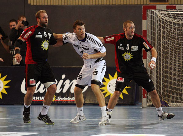 Klicken Sie zum Vergrößern! Robert Arrhenius hatte gegen die Lübbecker Abwehrhünen Siodmiak und Gustafsson einen schweren Stand.