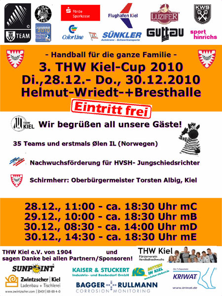 Die Handballabteilung des THW Kiel veranstaltet unter Schirmherrschaft des Kieler Oberbürgermeisters Torsten Albig, mit Unterstützung des Fördervereins Handballnachwuchs THW Kiel e.V., am 28./29./30. Dezember 2010 den 3. THW Kiel Cup.