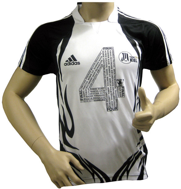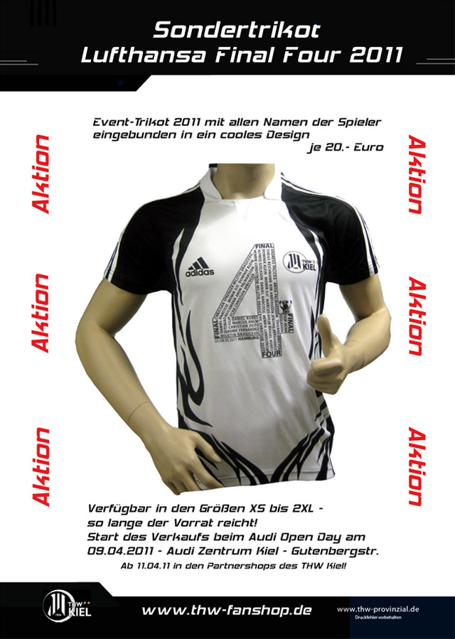 Rechtzeitig zum großen Handball-Event in Hamburg bietet der THW Kiel ein exklusives "Final Four"-Trikot für seine Fans an. Das weiße adidas-Trikot im trendigen "Zebra"-Look zeigt neben dem THW-Logo eine große Vier, in der alle Spielernamen eingetragen sind.