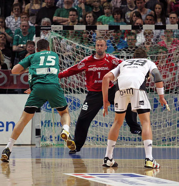 Es blieb aber in der Folge eine ausgeglichene Partie, in der sich beide Mannschaften schwer taten, die gegnerische 6:0-Deckung zu knacken. Als Filip Jicha einen Siebenmeter übers Tor warf und Linkshänder Daniel Valo zweimal Palicka überwinden konnte, stand es nach 17 Spielminuten wieder 8:8 unentschieden. Ein Doppelschlag von Sprenger bedeutete dann das 10:8, und nachdem Thierry Omeyer einen Strafwurf von Alois Mraz entschärfte, brachte Ilic den "Zebras" beim 11:8 den ersten Drei-Tore-Vorsprung. Sicherheit brachte dies den Kielern allerdings noch immer nicht. Zwei weitere Paraden des im ersten Durchgang starken Nikolai Weber, zwei Einzelaktionen von Alois Mraz und der dritte Treffer von Daniel Valo brachten sechs Minuten vor dem Seitenwechsel den erneuten Ausgleich zum 11:11.