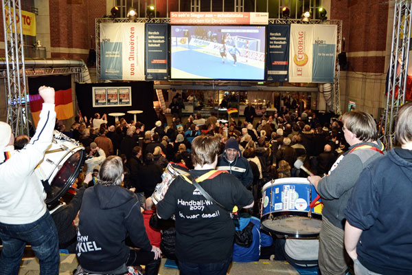 "So etwas gibt es auch nur in Kiel", staunte ein Mann aus Kassel, schulterte seinen Rucksack und entschwand, um seinen Zug nicht zu verpassen. Was im Rest der Republik vermutlich eine triste Veranstaltung wäre, ist im Norden eine muntere Geschichte. Rund 400 Zuschauer kamen gestern Abend in den "Handball-Bahnhof Kiel", um beim Public Viewing die deutsche Nationalmannschaft gegen Schweden zu bestaunen. "Ich tippe auf einen Sieg mit zwei, drei Toren", hatte Christian Zeitz zuvor Moderator Stefan Brasse gesagt, der mutig war, auf 31:24 setzte und damit erstaunlich gut lag.