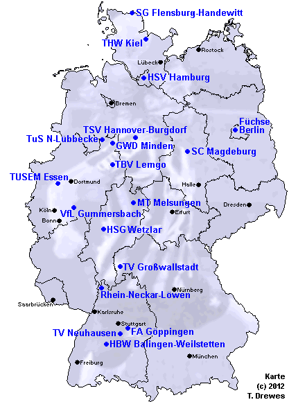 SG Flensburg-Handewitt THW Kiel HSV Hamburg Füchse Berlin SC Magdeburg TBV Lemgo MT Melsungen VfL Gummersbach TV Großwallstadt Rhein-Neckar-Löwen FA Göppingen HBW Balingen-Weilstetten TSV Hannover-Burgdorf TuS N-Lübbecke HSG Wetzlar TUSEM Essen GWD Minden TV Neuhausen