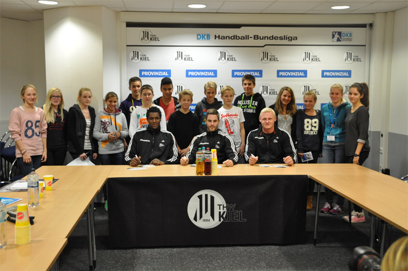 Los ging's mit der Fragerunde: Wie das Klima in der Mannschaft ist, ob das THW-Team schlechter als letztes Jahr sei, was die drei Handballer nach ihrer Karriere planen. Die Spieler antworteten gut gelaunt und offen. Die Schülerreporter schrieben fleißig mit und erfuhren, dass Andreas Palicka gerne mit Aktien handelt. Oder dass Patrick Wiencek bald nebenher studieren möchte. Nach einer Stunde waren alle Fragen beantwortet. Klar, Autogrammstunde und das persönliche Foto durften nicht fehlen. "Die waren locker und lustig", sagte Lina Vödisch von der Heinrich-Heine-Schule in Heikendorf anschließend mit einem breiten Grinsen im Gesicht.