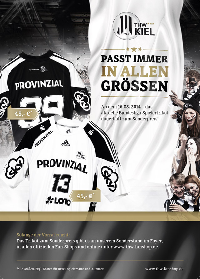 Ab Sonntag, dem 16. März, ist das Trikot, in dem unsere Mannschaft im vergangenen Jahr den Meistertitel und den DHB-Pokal holte und in dieser Saison erneut die Schale gewinnen möchte, dauerhaft reduziert: Erhältlich ist das original Bundesliga-Trikot des THW Kiel größenunabhängig dann für nur noch 45 Euro (statt 65 beziehungsweise 49 Euro).