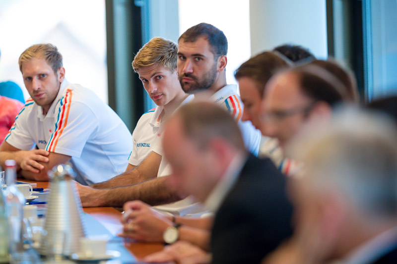 Klicken Sie zum Vergrößern! Steffen Weinhold, Rune Dahmke und Joan Canellas verfolgen aufmerksam die Pressekonferenz.
