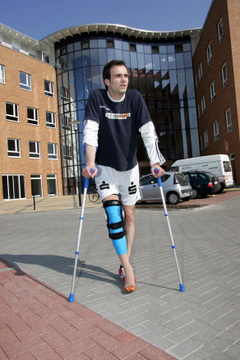 | THW-Mannschaftsarzt Dr. Frank Pries erklärt Viktor Szilagyi, der auf einer Behandlungsliege liegt, anhand eines Modells die Verletzung im Knie. | THW-Mannschaftsarzt Dr. Frank Pries untersucht Viktor Szilagyi nach seiner Operation am Knie zur Kontrolle. | THW-Mannschaftsarzt Dr. Frank Pries erklärt Viktor Szilagyi, der auf einer Behandlungsliege liegt, anhand eines Modells die Verletzung im Knie. | Warten und Geduld ist jetzt angesagt: Viktor Szilagyi sitzt vor seinem Arzt-Besuch im Wartezimmer des Mare Klinikum in Kronshagen. | |||