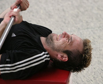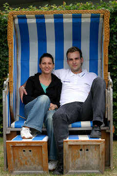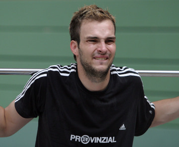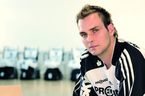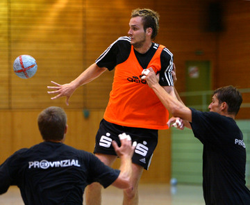 Trainingslager 2005: Neuzugang Viktor Szilagyi stemmt mit schmerzverzerrtem Gesicht eine Hantelstange. Trainingslager 2005: Neuzugang Viktor Szilagyi stemmt mit schmerzverzerrtem Gesicht eine Hantelstange. Trainingslager 2005: Neuzugang Viktor Szilagyi überspringt in einem Trainingsspiel die beiden Abwehrspieler Stefan Lövgren und Frode Hagen. Golfen 2005: THW-Neuzugang Viktor Szilagyi und seine Freundin Nora Moosbrugger.