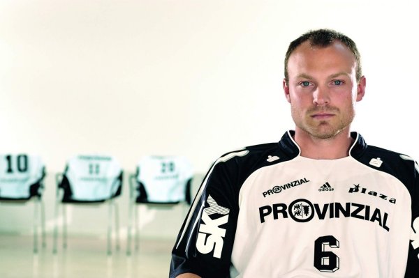 Deckungsarbeit. Henrik Lundström in seinem ersten Spiel in der Ostseehalle für den THW. Autogrammkarte 2004/2005: Henrik Lundström. Henrik Lundström in action.