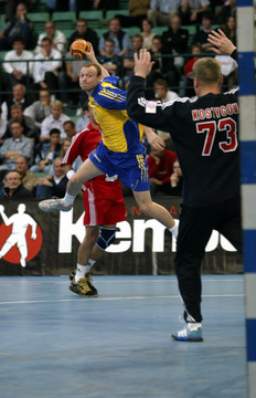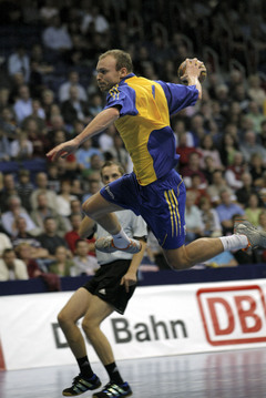 World Cup 2006, SWE - CRO: Henrik Lundström. World Cup 2006: "Henke" und Kim. TuS-Kreisläufer Patrick Fölser bricht durch. Stefan Schröder stößt Henrik Lundström.