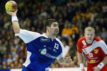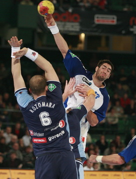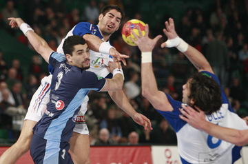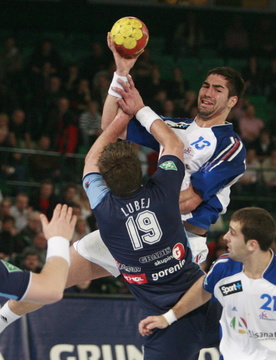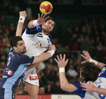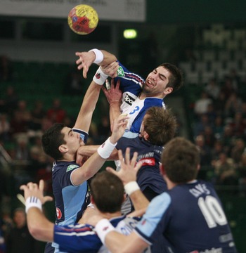 | Xepkin am Kreis. | Deckungsarbeit. | Nikola Karabatic beim Strafwurf. | Nikola Karabatic. | |||