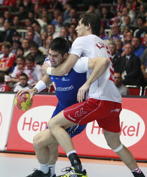 | Nikola Karabatic. | Nikola Karabatic. | Nikola Karabatic wird von Michael V. Knudsen attackiert. | Deckung! | |||
