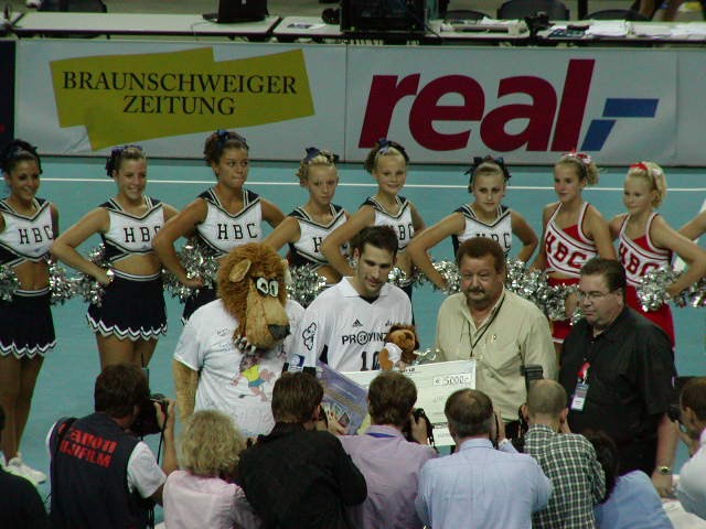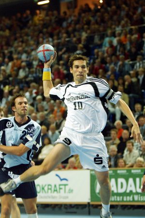 | Jacob-Cement-Cup 2002: Stefan Lövgren zieht ab. | Jacob-Cement-Cup 2002: Stefan Lövgren. | Handball-Bundesliga-Cup 2002: Kapitän Stefan Lövgren nimmt den Siegerscheck entgegen. | Lövgren, Serdarusic, Dominikovic. | |||
