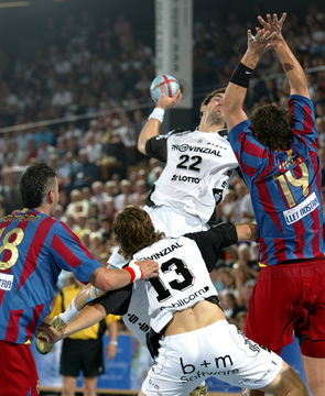 | Omeyer und Karabatic. | Nikola Karabatic gegen Jan-Olaf Immel. | Anders Oechsler gegen Nikola Karabatic. | Jens Tiedtke. | |||