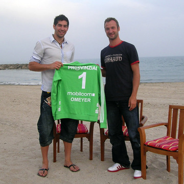 | Vertragsunterzeichnung zwischen dem THW Kiel und Thierry Omeyer am 27.06.06 am Strand bei Montpellier. Links Karabatic, rechts Schwenker. | Vertragsunterzeichnung am 27.06.2006 am Strand bei Montpellier. Nikola Karabatic und Thierry Omeyer zeigen das neue Torhüter-Trikot. | EM 2006: Thierry Omeyer hinter der französischen Mauer. | EM 2006: Thierry Omeyer hinter der französischen Mauer. | |||