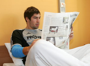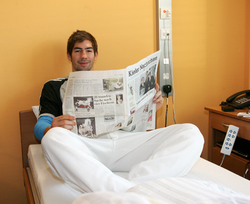 | Karabatic konnte nicht eingesetzt werden. | Nikola Karabatic wird von seinem Bruder aus dem Krankenjaus abgeholt. | Dr. Frank Pries untersucht Nikola Karabatic. | Dr. Frank Pries untersucht Nikola Karabatic. | |||