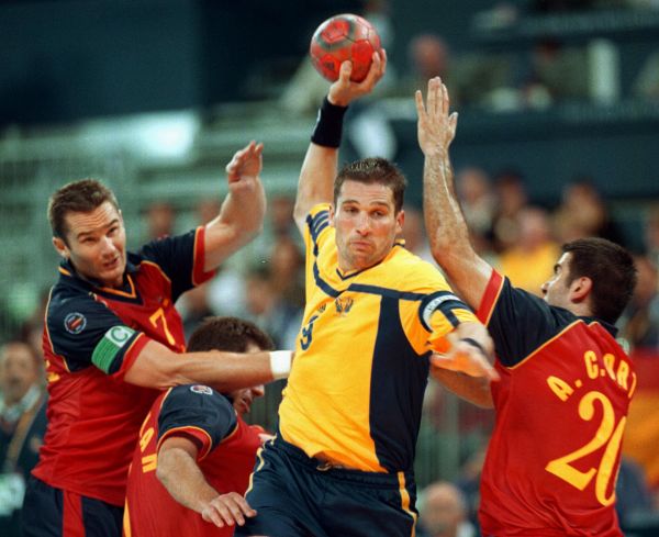 | Lövgren und Perunicic stoppen Xepkin. | Lövgren und Perunicic gegen Lozano. | Stefan Lövgren beim 7m gegen David Barrufet. | Lövgren gegen Lozano. | |||