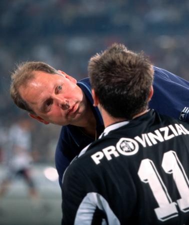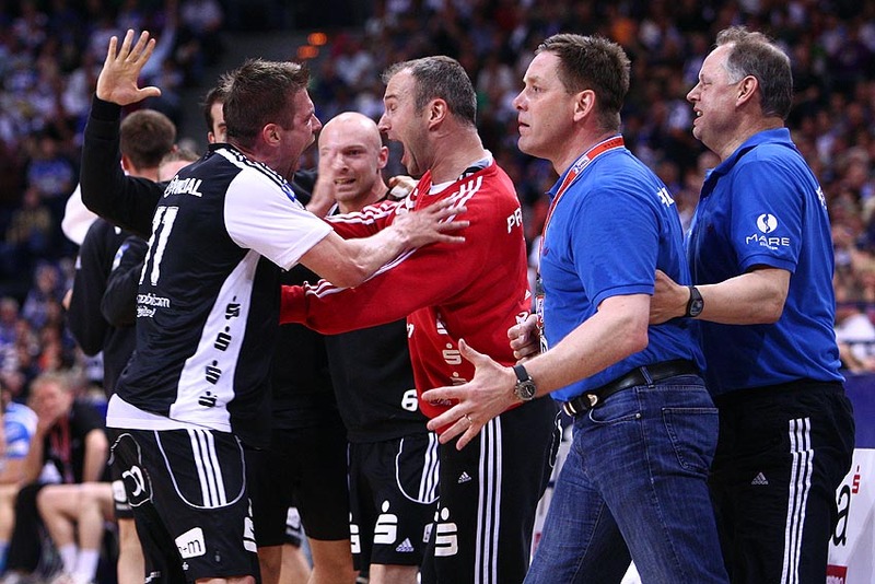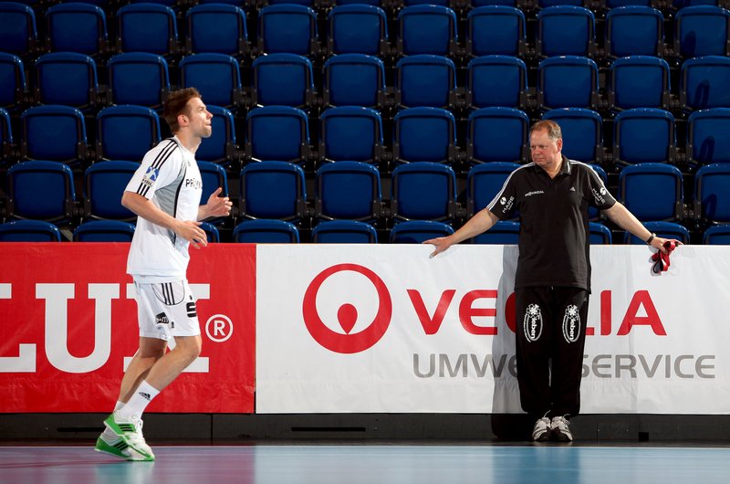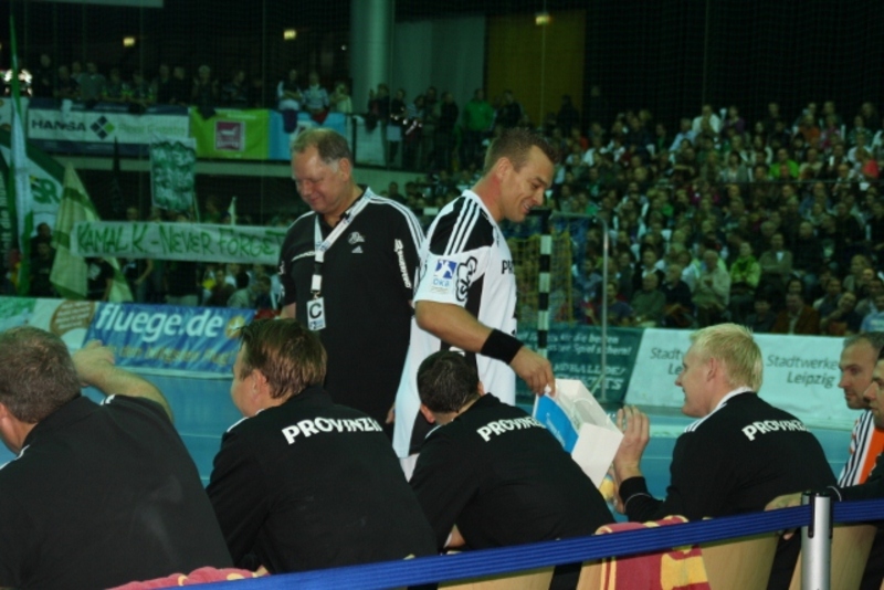 Andersson und Brandenburg machen Dehnübungen. Deutscher Meister! Adrian Wagner liegt verletzt am Boden, Physiotherapeut Uwe Brandenburg (mitte) und Mannschaftsarzt Dr. Detlev Brandecker (rechts) kümmern sich um den Linksaußen. Uwe Brandenburg kümmert sich um Viktor Szilagyi.