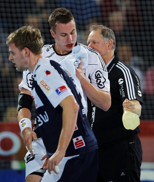 Dominik Klein blutet nach der Attacke von Dinart und Davis. Klein blutet nach der Attacke von Dinart und Davis. Dehnungsübungen. Die Physiotherapeuten.