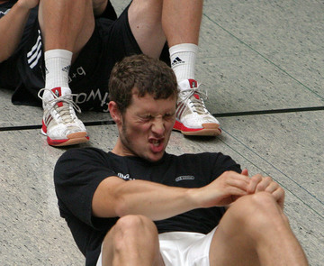 | Die Kieler Auswechselbank. | Autogrammkarte 2005/2006: Christoph Schindler. | Trainingslager 2005: Festes Ritual: Kurz nach sechs geht es zum morgendlichen Waldlauf rund um den Mühlenteich. | Trainingslager 2005: Der Name ist Programm: Christoph Schindler schindet sich beim Bauchmuskeltraining. | |||