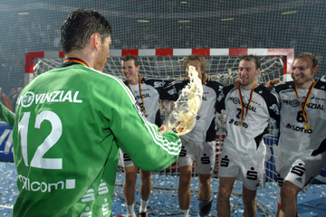| Meisterfeier auf dem Kieler Rathausplatz. | Meisterfeier auf dem Kieler Rathausplatz: Youngster Christoph Schindler springt Christian Zeitz in die Arme. | Meisterfeier auf dem Kieler Rathausplatz und müde Helden. Von links Marcus Ahlm, Christoph Schindler und Stefan Lövgren. | Christoph Schindler in seinem ersten Europapokalspiel. | |||
