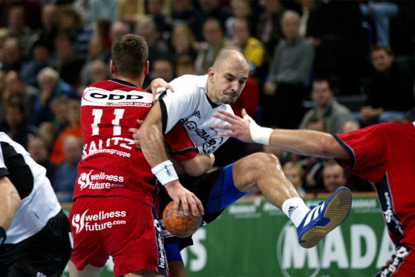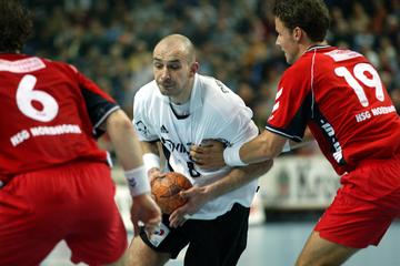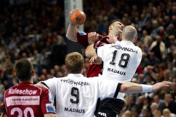 Senianin Maglajlija setzt sich gegen Dominikovic und Bjerre durch. Die THW-Deckung packt zu. Davor Dominikovic. Davor Dominikovic.